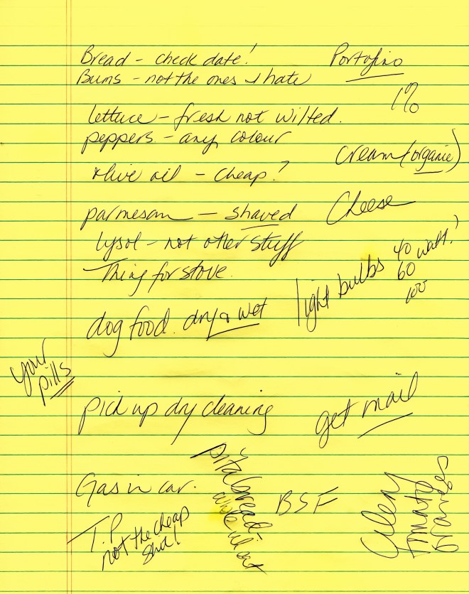 It might as well have been in Sanskrit. NOT a shopping list. Nor a reminder, or even a handy reference. Oh sure, it started with good intentions; tidy, organized, logical. Then, noticeably at ‘Peppers – Any Colour’, Mom unilaterally decided that Dad would be assigned the shopping job, and bailed. At that point it became nothing more than a dismissive cruelty delivered upon a fine and upstanding man – half Philanthropist, half selfless workhorse. Unaware of the wily legerdemain afoot, he blithely intended to fulfill the list.