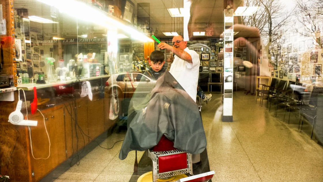 Young lad gets a trim in St. John’s NFLD, while Geoffrey Kelly & I pass by. Geoff took a similar shot on his little camera, but I managed to get my reflection in this one. A throwback to a different era, on many levels.