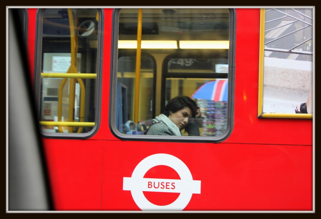 Someone deep in thought on London bus.